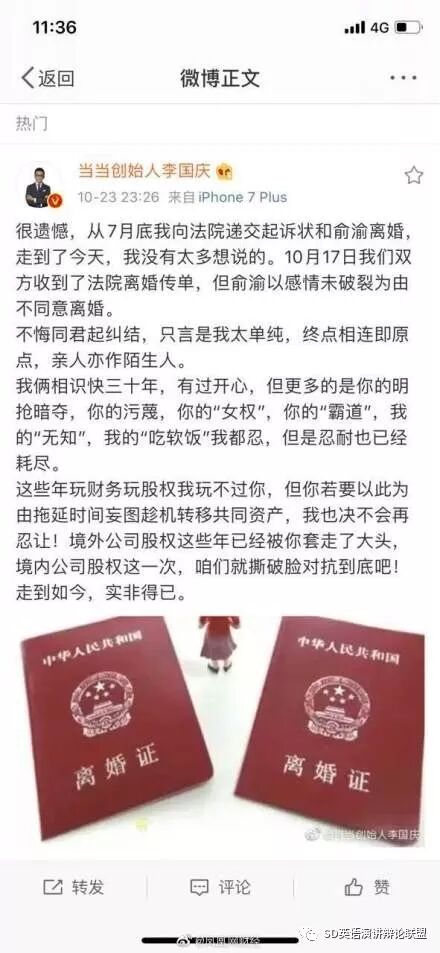 不管市井匹夫还是江湖大佬都会低调处理的事儿,李国庆同志居然微博直播而且直接开撕,果然很李国庆。一贯隐忍的俞渝,这次大概真的彪了,还是直接看俞渝朋友圈的截图吧。