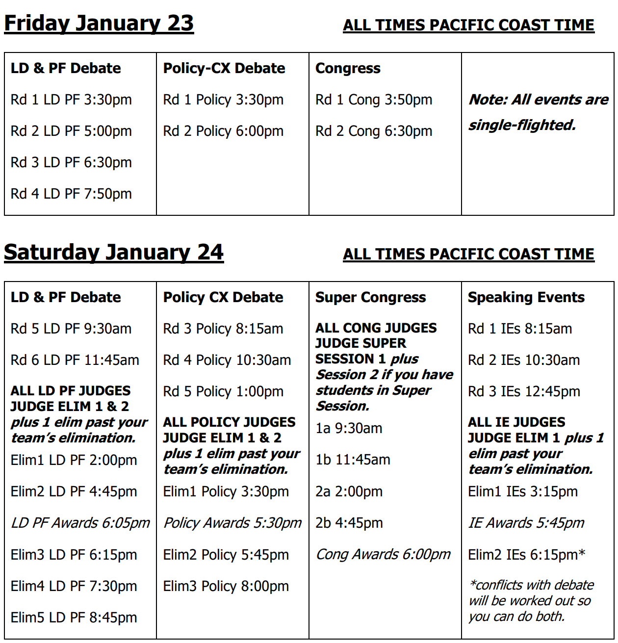 • PUBLIC FORUM DEBATE: We offer Junior and Open divisions of Public Forum. Rounds will follow standard PF time format (4-4-3-4-4-3-3-3-3-2-2) with 3 minutes of prep per team and teams will coin flip for pro/con or 1st/2nd speaker.