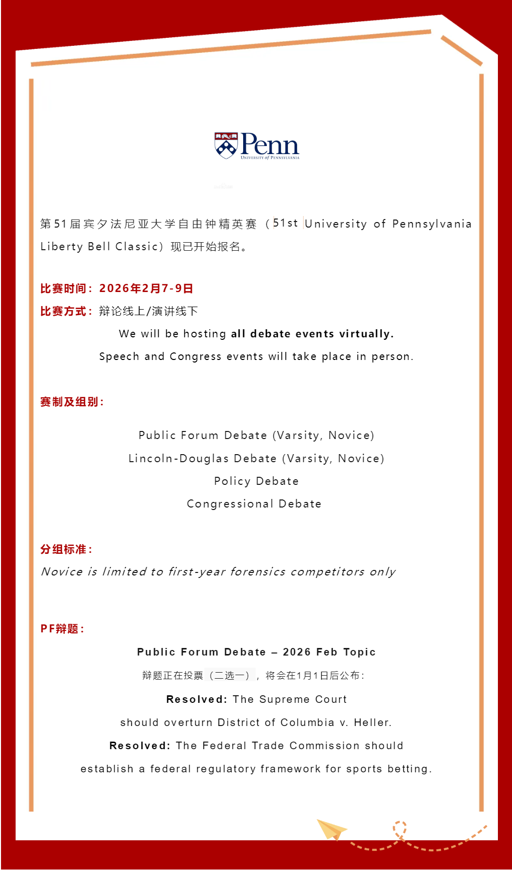 组别:[JV, Varsity, Novice] Lincoln-Douglas Debate / [JV, Varsity, Novice] Public Forum Debate