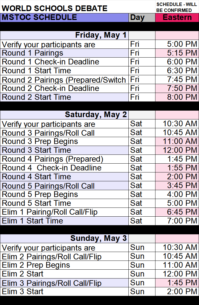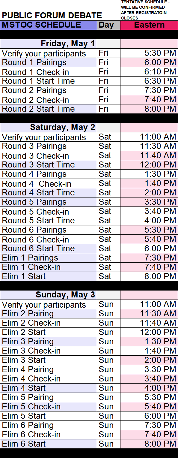All events are governed by the rules found in the 2026 Middle School Tournament of Champions procedures documents posted on Tabroom. Coaches, judges, and competitors should familiarize themselves with these materials prior to the start of the tournament. Please note that any sources read or cited as evidence in competition must be available upon request.