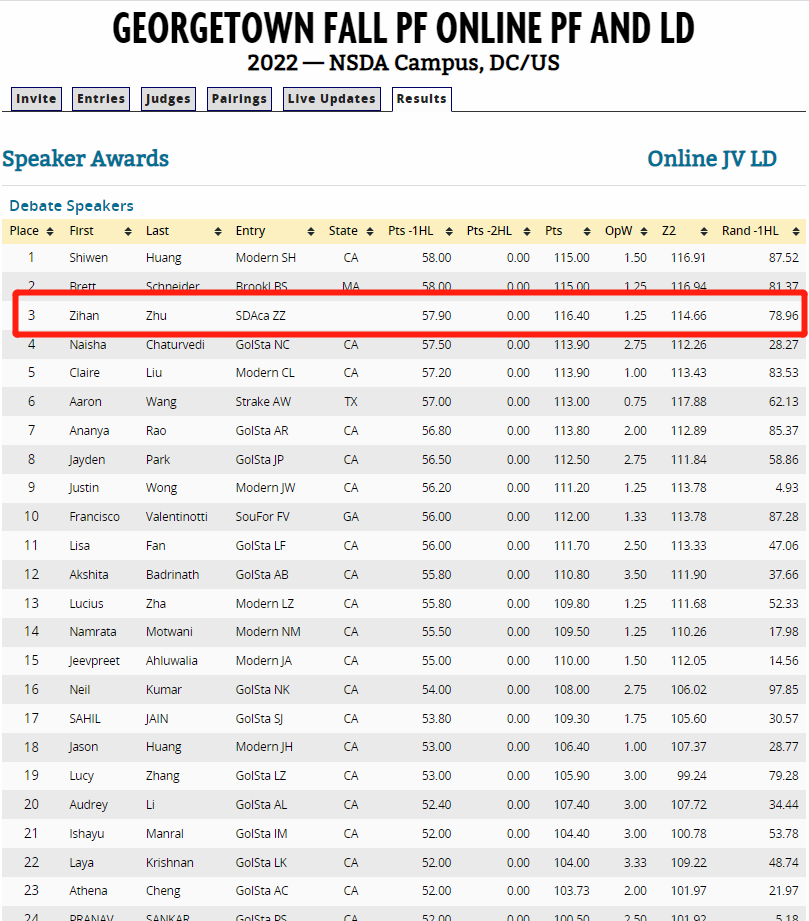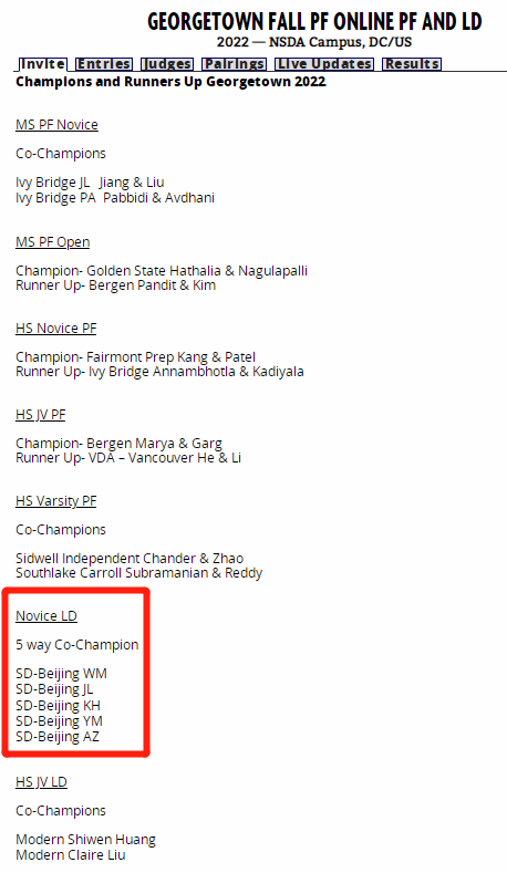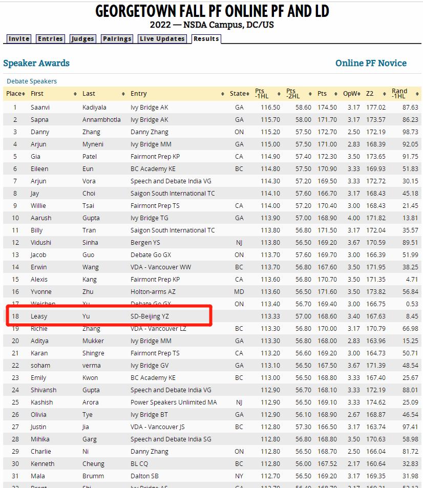 10月举行的乔治城大学秋季赛(Georgetown Fall 2022),SDCamps的选手斩获了Novice LD组冠军及高中组Junior Varsity LD组第三名,同时在参加人数较多的PF组别获得了辩手排名第18的好成绩: