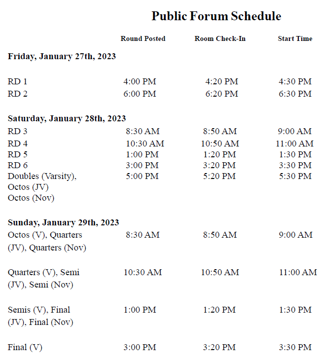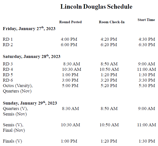 Lincoln-Douglas will follow the 6-3-7- 3-4-6-3 format, with 4 minutes of prep time. Ties will be broken based on record, adjusted points, total points, double-adjusted points, judge variance, opponent wins, and flip of a coin, in that order. The break will depend on the number of teams registered.Public Forum Debate