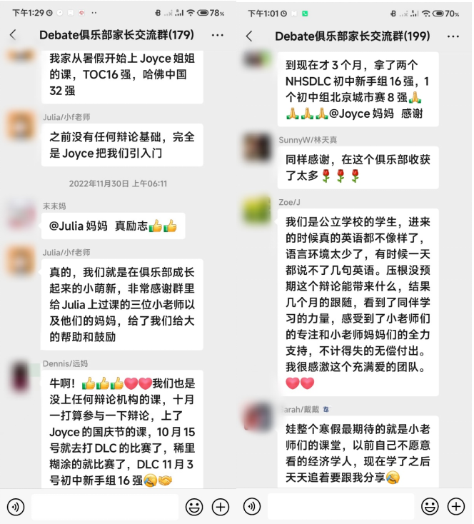 在2022年初移居加拿大后,面对同一地标搭档缺席的局面,Joyce进行了一系列“自救”行动,却在“自救”行动中不知不觉提升了自己的leadership。 在参加了几次欧美赛事后,Joyce发现有部分西方裁判,对于亚洲面孔仍有一定的不公平现象,同时考虑到高中阶段如果目标进入加拿大国家辩论队,需要有本地的搭档从省赛层层晋级。为此,Joyce多次游说学校的老师和校长,最终在2022年秋季促成了校内辩论队的成立,并担任辩论队leader,从零开始教自己的校内小伙伴学辩论。2022年底,她的备赛小团队里,出现了西方面孔。 “三J”小团队成立的线上辩论俱乐部,在几次公开课后收获了一批小粉妹小粉弟。三个“小老师”带着一批学习意愿强烈的小伙伴启动了俱乐部定期小组workshop。近半年的小组活动,俱乐部成长起来的小萌新也已经开始在赛场上收获赛绩。