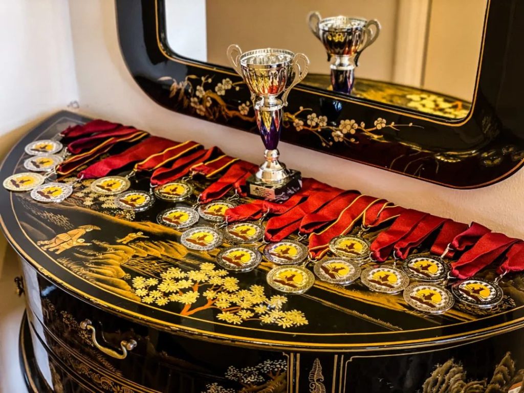 “G4抱佛脚战队”在伦敦全球轮获得的奖杯、奖牌
