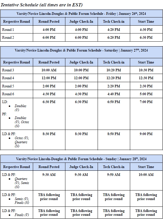 Lincoln-Douglas will follow the 6-3-7- 3-4-6-3 format, with 4 minutes of prep time. Ties will be broken based on record, adjusted points, total points, double-adjusted points, judge variance, opponent wins, and flip of a coin, in that order. The break will depend on the number of teams registered.