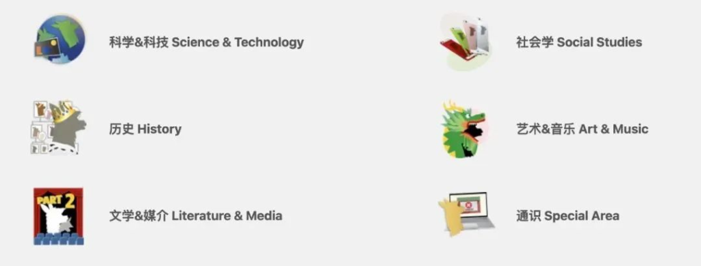 六个学科:通识(Special Area), 历史(History), 科学(Science&Technology), 艺术(Art&Music), 社会学(Social Studies)和文学(Literature &Media)
