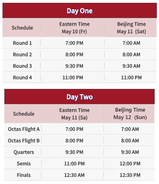 Pairings will be released approximately 15 minutes prior to start time.All participants should report to the online rooms within 5 minutes after pairings are released.All participants must return to and remain in the online rooms 10 minutes before the start time.