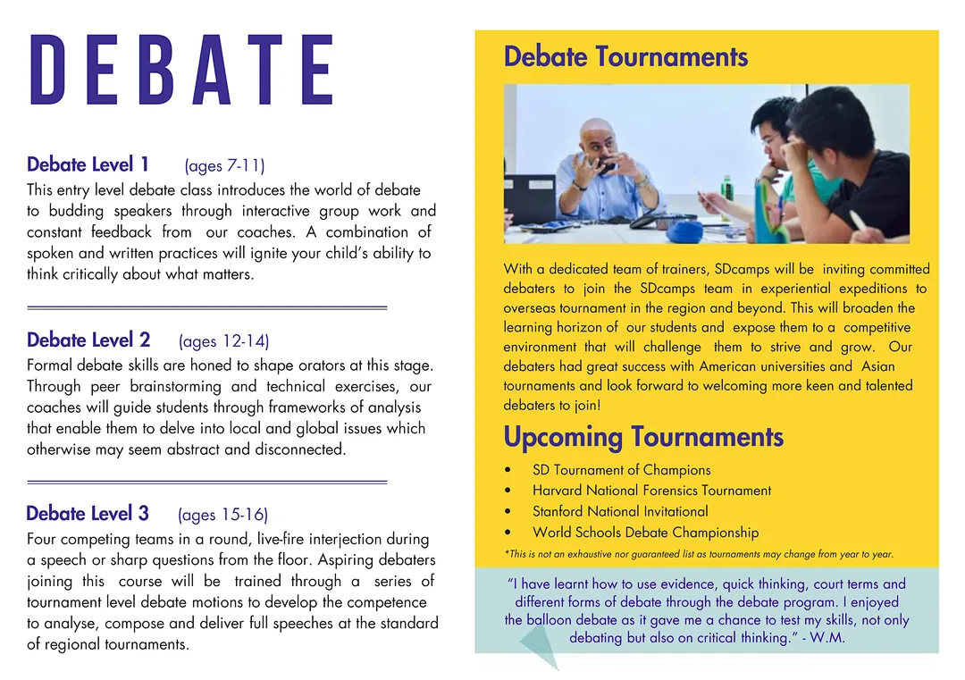 SDcamps·演辩营暑期持续为您提供专业的演讲和辩论课程及备赛指导服务。我们的教练团队由经验丰富的专业教练组成,采用成熟的美国加州培训课程体系,适合从小学1年级到高中学生的不同年龄组。课程内容涵盖基础班、中级班、高级班、晋级班、各类备赛班及专项赛制班,全方位满足学生的学习需求。