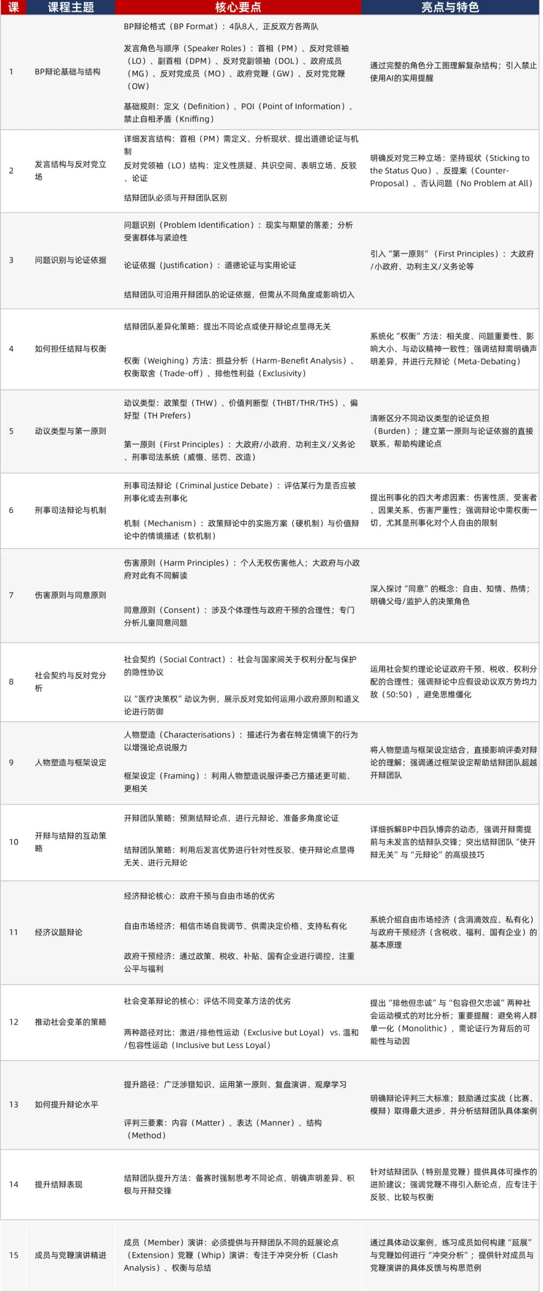 SDcamps•演辩营专业教练的小班课程(4-6人班,不超过8人),国外专业辩论教练,除我们统一安排的班型和课程内容,也可以自由组班,可以按自由组班辩手的情况和参赛需求进行培训。详询下方小助手微信。班课课程安排如下(滚动招生):